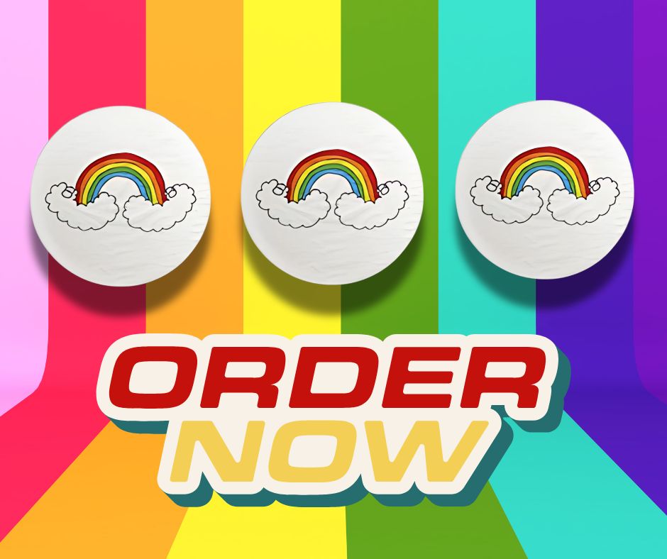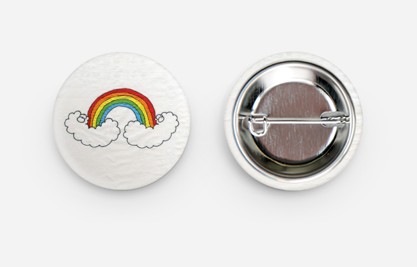 Three 1″ round, full-color printed buttons with sturdy steel pins.